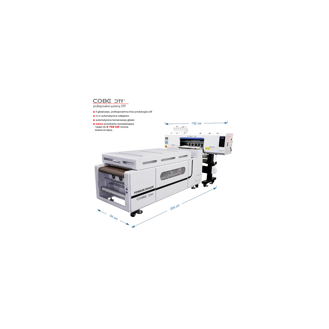 Przemysłowa drukarka DTF 60 cm Cobe z 4 głowicami Epson I3200 i automatyczną proszkarką – szybka produkcja nadruków na odzieży z wysoką jakością oraz oszczędnością energii sięgającą nawet ok. 8760 kWh rocznie w porównaniu z tradycyjnymi piecami.