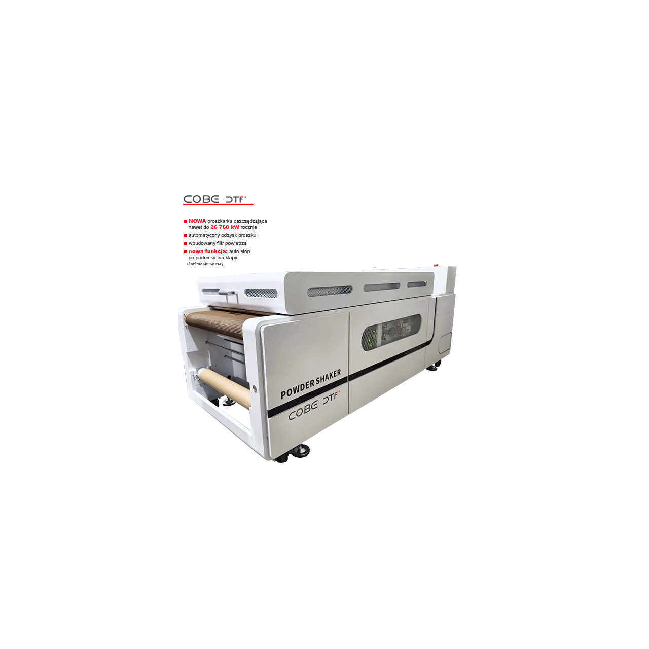 Automatyczna proszkarka z taśmą teflonową i systemem podsysu przejmuje folię bezpośrednio z drukarki, równomiernie nakłada proszek i utrwala go w jednej, spójnej operacji. Dzięki temu cała linia DTF Cobe pracuje szybko, stabilnie i praktycznie bezobsługowo, idealnie sprawdzając się przy dużych nakładach i pracy wielozmianowej.